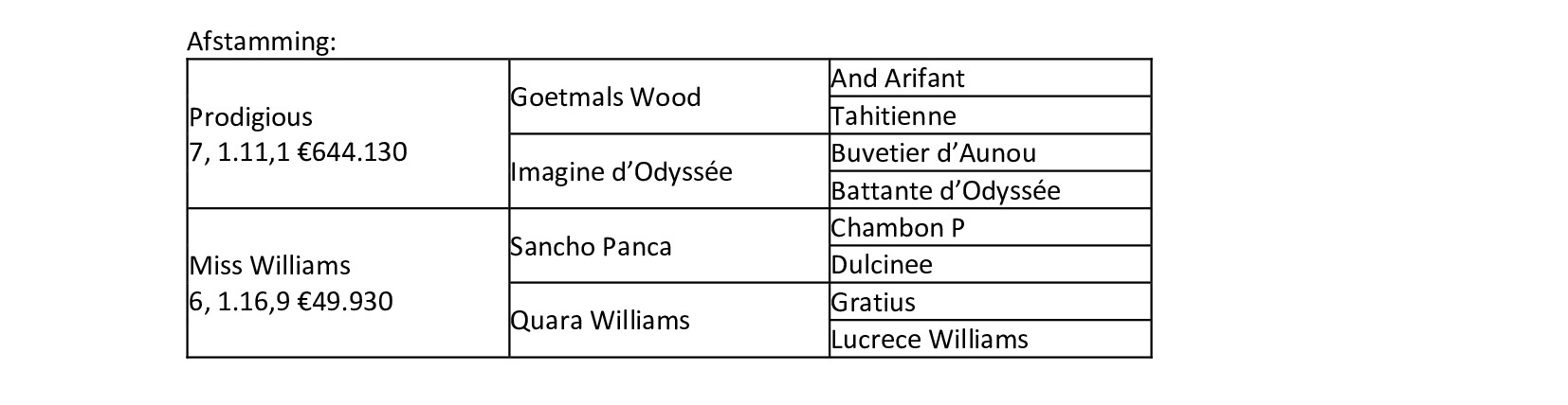 - Une Miss Williams, 4, 1.19,0 €14.950; moeder van Horseris, 6, 1.12,2 €163.660