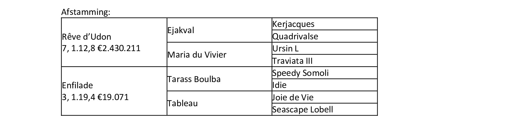 Productie Rêve d'Udon: Offshore Dream, 7, 1.10,1, €1.992.024, Revenue, 8, 1.09,4, SEK16.703.971, Glissando, 7, 1.12,8, €565.393, Historien, 4, 1.14,0, €485.457, Little Boy, 7, 1.12,3, €483.120, Nepeta, 5, 1.12,6, €332.570, Ikanga, 7, 1.14,2, €305.037, Job d'Udon, 8, 1.12,6, €297.861, Fou Reveur, 9, 1.14,6, €274.113, Graviere, 8, 1.13,5, €265.131 eva.